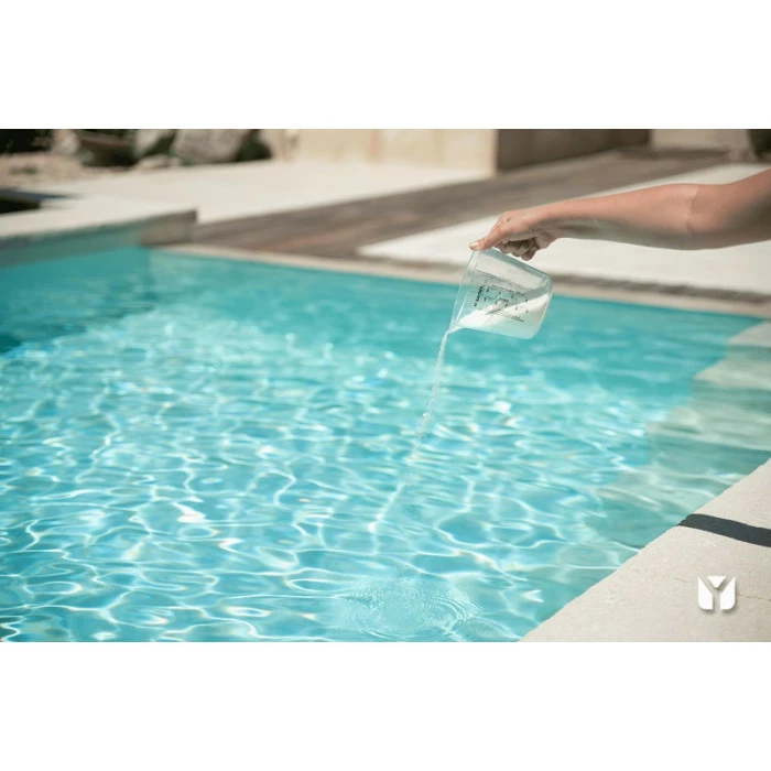 Le dosage recommandé pour votre bassin est de 250 g pour 10 m³, à disperser directement dans l’eau et non dans votre système de filtration.