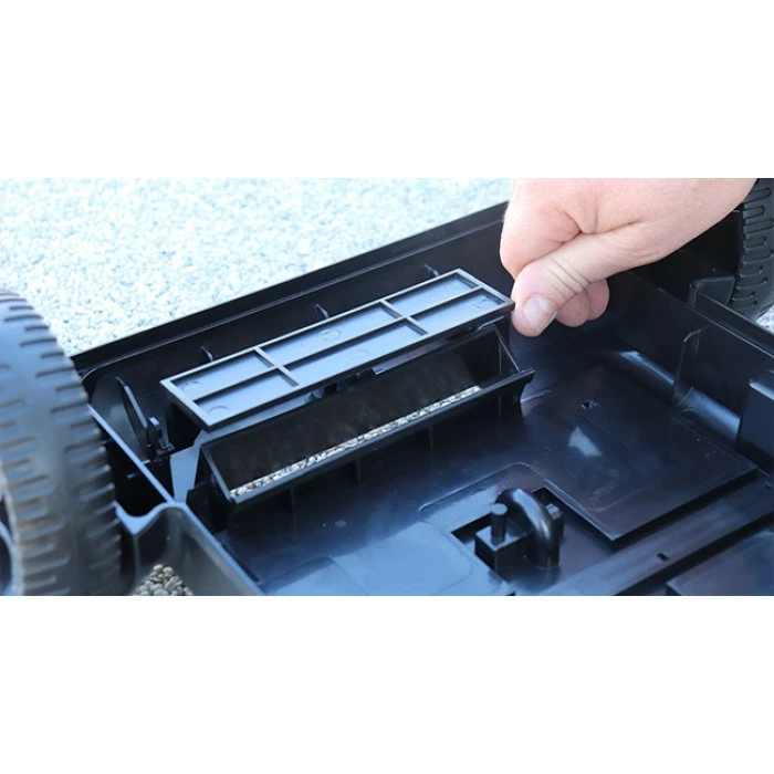 Pour ramasser efficacement tous les débris du fond du bassin, le châssis du robot est équipé de deux larges bouches d’aspiration et d’une brosse centrale. Son filtre lui permet de garder les plus petites particules jusqu’à 150 µm.