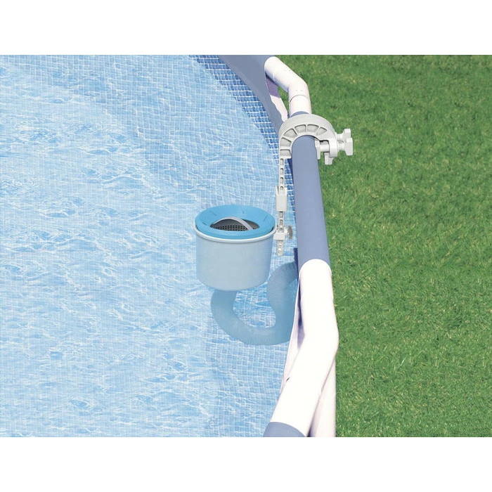 Le skimmer est livré avec 2 fixations pour pouvoir s’adapter sur une piscine autostable (crochet + bras) ou tubulaire (crochet).