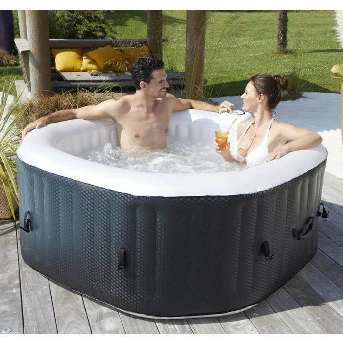 Habillé de noir carbone à l’extérieur et de blanc à l’intérieur, ce spa gonflable vous offre 600 litres d’eau à une température située entre 20 et 40°C selon vos envies, en été comme en hiver.